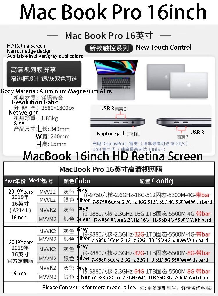 | 2019Years 16inch VK2 Gray VM2 Silver i9-16G/1TB | 1064 |