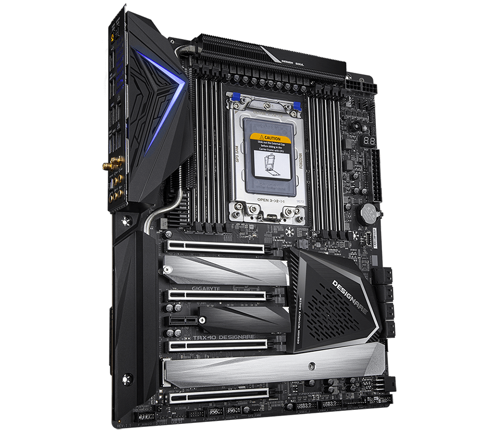 AMD TRX40 DESIGNARE Motherboard with Direct 16+3 Phases Infineon Digital VRM, Fins-Array Heatsink, Dual Intel LAN, 4 PCIe 4.0 M.2 with Thermal Guards, Bundled GC-Titan Ridge Add-In Card and AORUS Gen4 AIC Adaptor, Intel® WiFi 6 802.11ax, Realtek High-End HD Audio